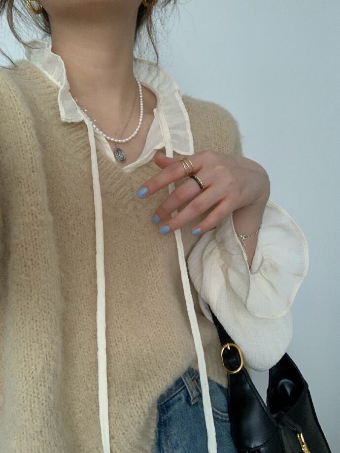 3.フリルネックはリボンでアレンジ可能