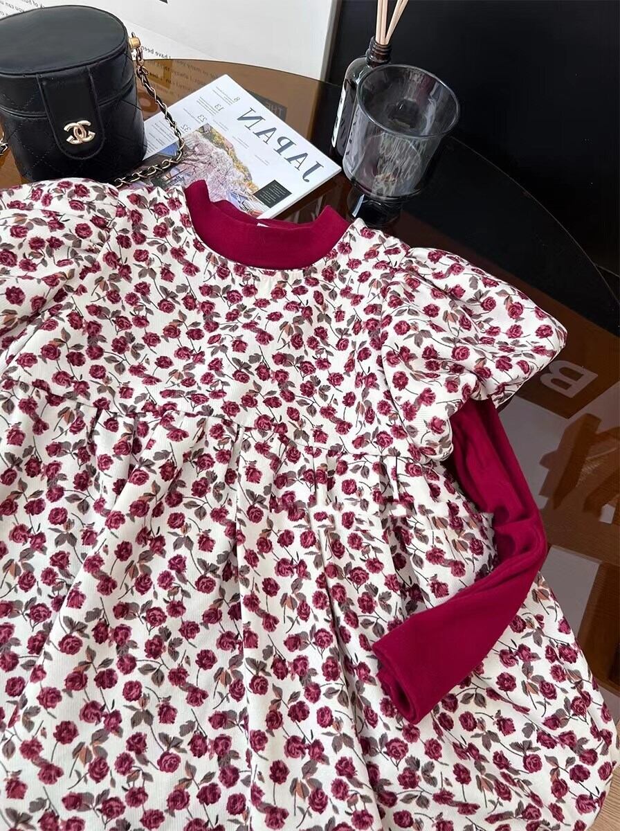女の子 重ね着 子供服 2点セットアップ インナー 総柄 ワンピース おしゃれ