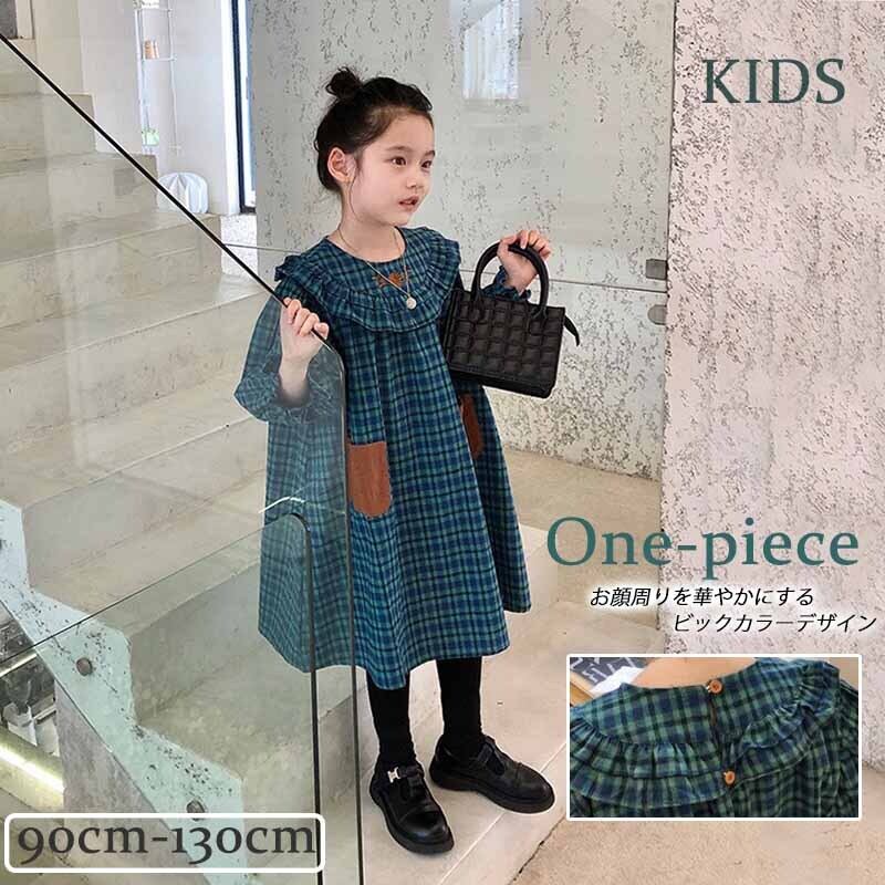 韓国子供服 子供 キッズ ワンピース チェック ビックカラー 襟 かわいい グリーン 緑