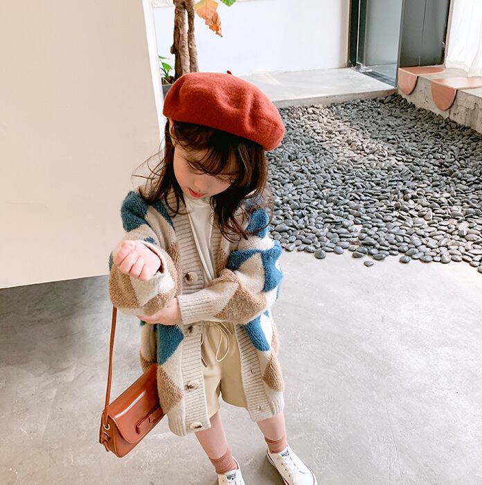 秋新作 女の子 ロッグ ニットコート カーディガン 子供服 菱形柄 トップス 前開き 子供ジレ